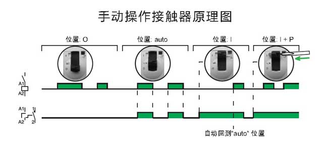 ·手動操控的接觸器在其前端面有4個位置選擇開關(guān):自動操作模式;臨時“開”;永久“開”: 用于鎖定安裝維護過程中處于“開”位置的接觸器;關(guān)斷狀態(tài)